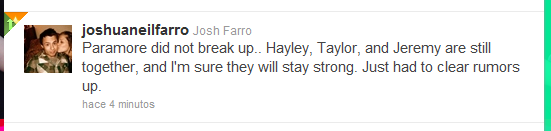 "Paramore no se separa.. Hayley, Taylor y Jeremy permanecen juntos, estoy seguro que ellos seguiran siendo fuertes. nada mas queria limpiar los rumores.-